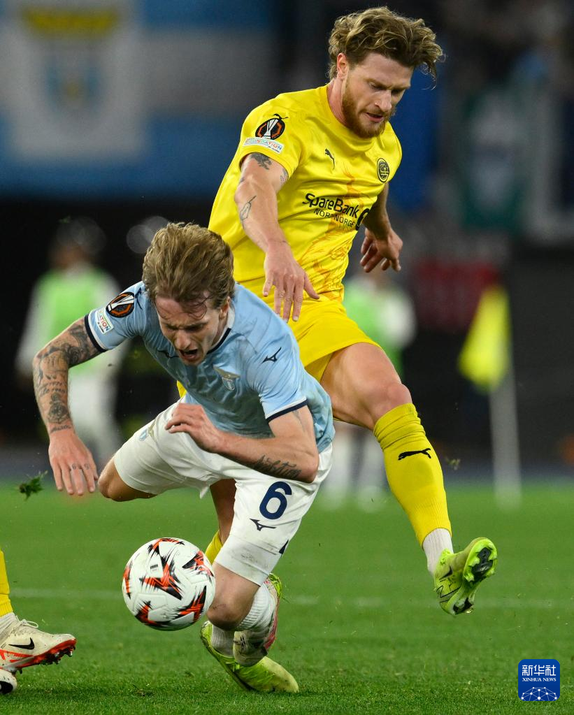 4月17日,拉齐奥队球员罗韦拉(左)与博德闪耀队球员加斯帕·霍在比赛中拼抢。