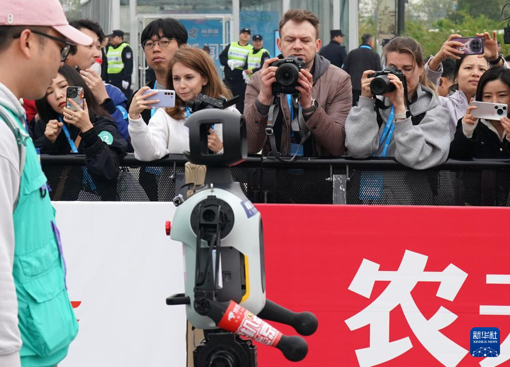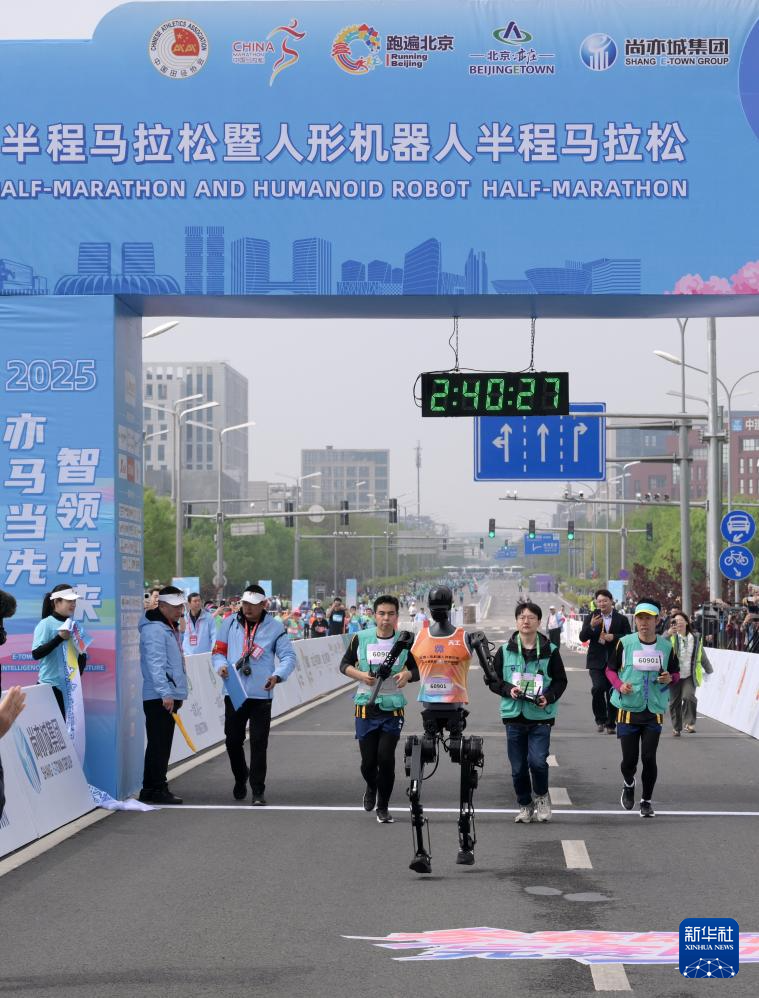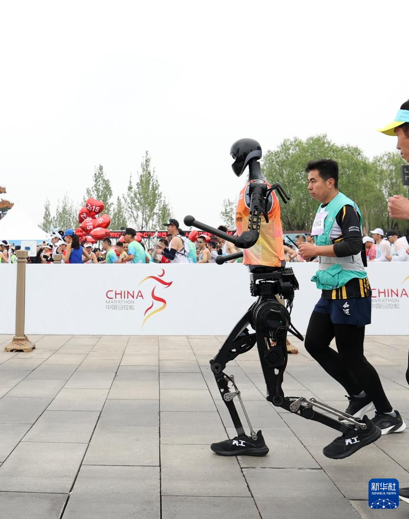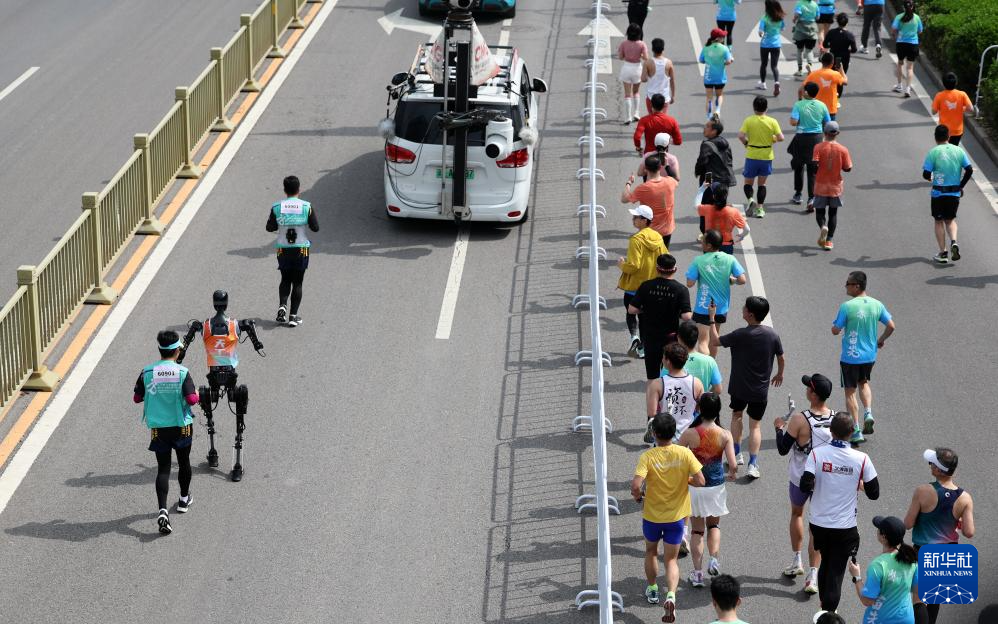4月19日,参赛选手与人形机器人共同冲出起跑线。