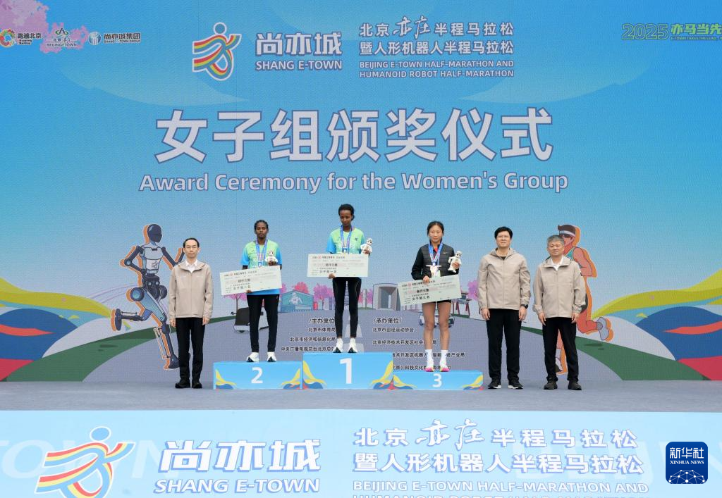 4月19日,2025北京亦庄半程马拉松女子组冠军埃塞俄比亚选手凯贝德·哈维·古达塔(左三)、亚军埃塞俄比亚选手艾纳勒姆·特内贝布·内加(左二)和季军中国选手李媛(右三)在颁奖仪式上。