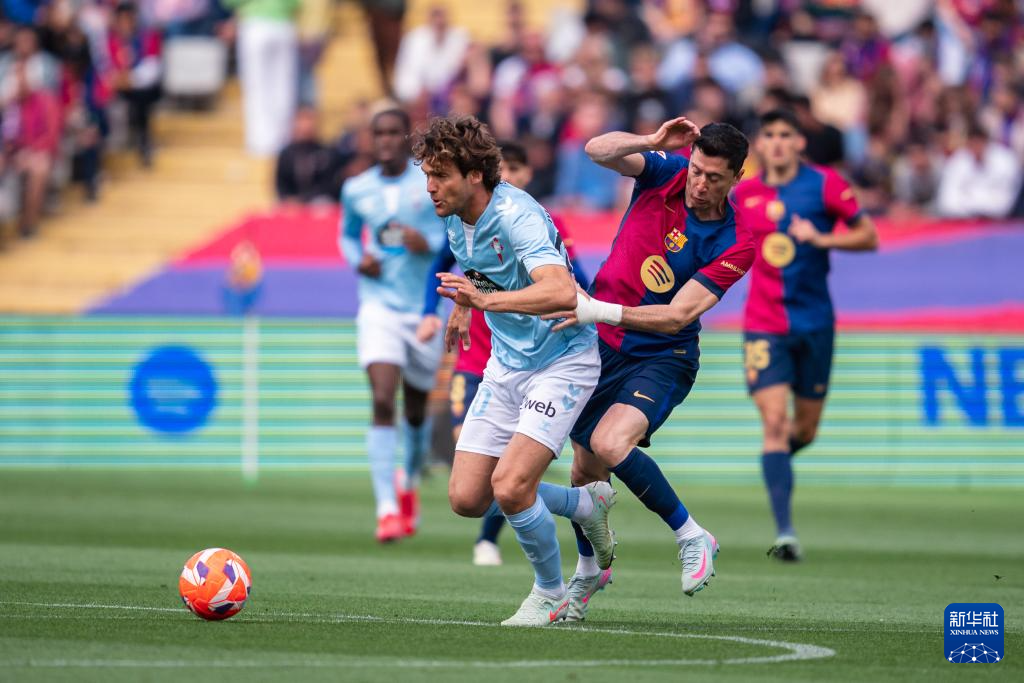 4月19日,巴塞罗那队球员莱万多夫斯基(前右)和塞尔塔球员马科斯·阿隆索在比赛中拼抢。