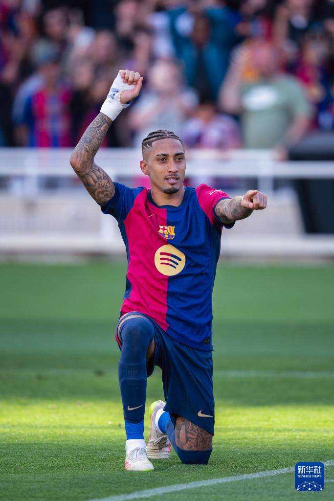4月19日,巴塞罗那队球员拉菲尼亚在比赛中庆祝进球。