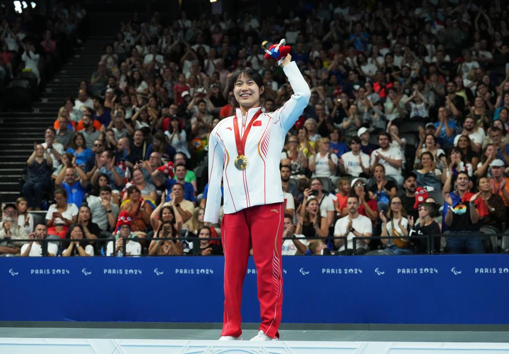 ↑2024年9月7日,蒋裕燕在巴黎残奥会女子100米仰泳S6级颁奖仪式上。她以1分19秒44的成绩打破世界纪录获得冠军。新华社记者 高静 摄