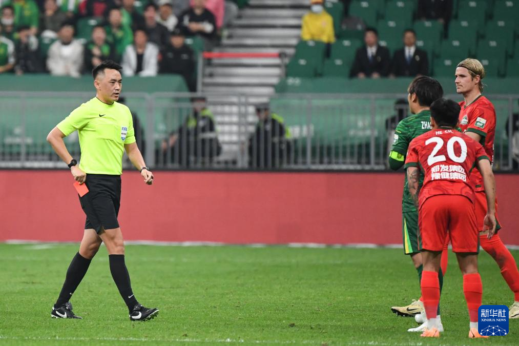 4月25日,主裁判杜健鑫(左一)在比赛中准备向北京国安队球员张稀哲出示红牌。
