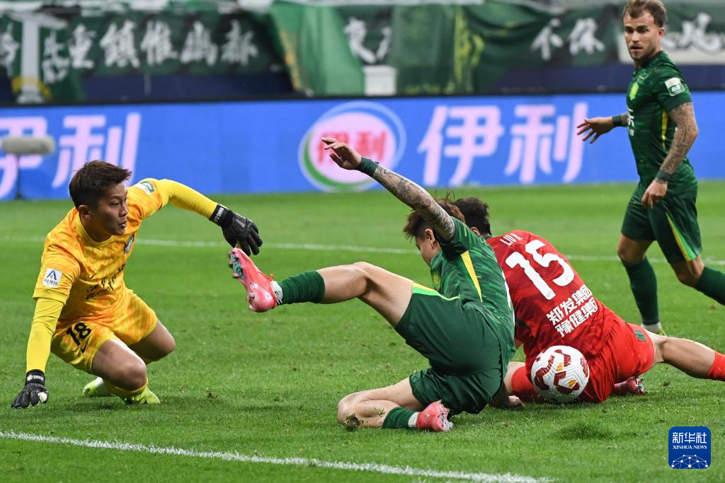 4月25日,河南俱乐部酒祖杜康队守门员王国明(左一)、球员刘斌(右二)在比赛中防守北京国安队球员杨立瑜(左二)的射门。