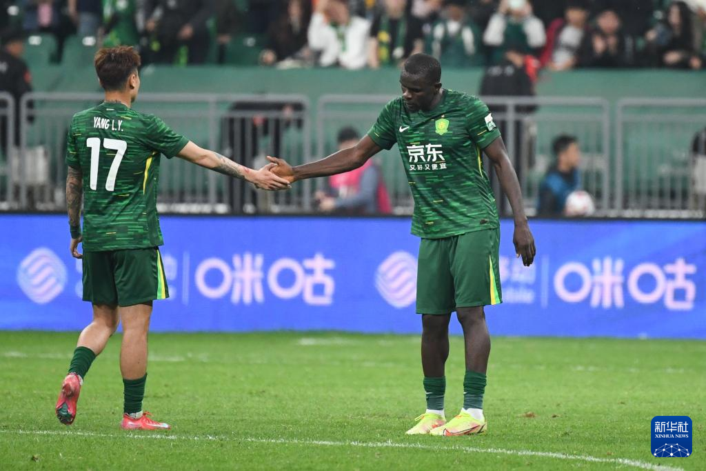 4月25日,北京国安队球员恩加德乌(右)在比赛结束后与队友杨立瑜击掌庆祝胜利。