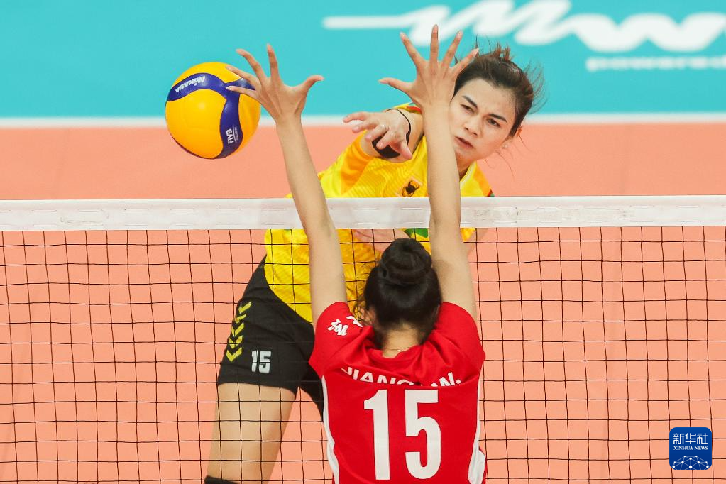4月26日,北汽女排俱乐部队球员单兰沣(左)在比赛中扣球。