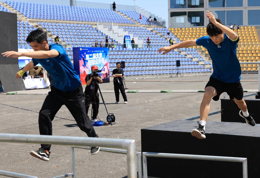 5月1日,跑酷选手在北京跑酷公开赛中。新华社记者 张晨霖 摄