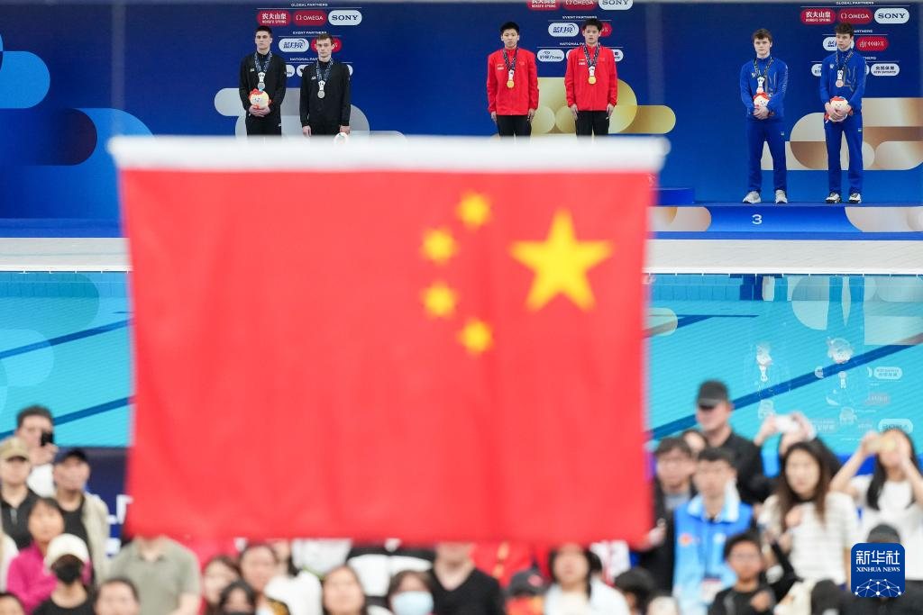 5月2日,获得冠军的中国组合程子龙(上左三)/朱子锋(上右三)、获得亚军的中立运动员组合施莱赫尔(上左二)/捷尔诺夫(上左一)和获得季军的乌克兰组合赫里岑科(上右一)/谢列达在颁奖仪式上。