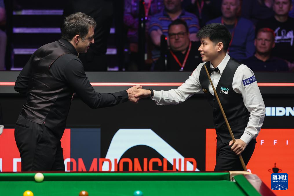 5月2日,赵心童(右)在比赛前与奥沙利文握手致意。