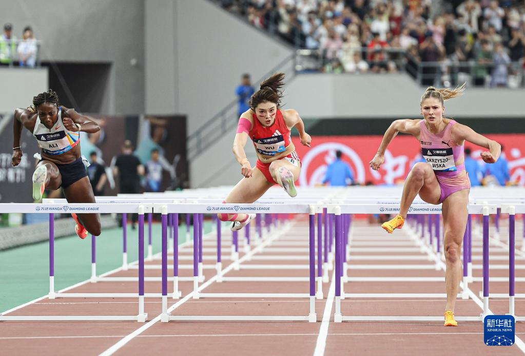 5月3日,中国选手吴艳妮(中)在女子100米栏比赛中。她以12秒96的成绩获得第八名。