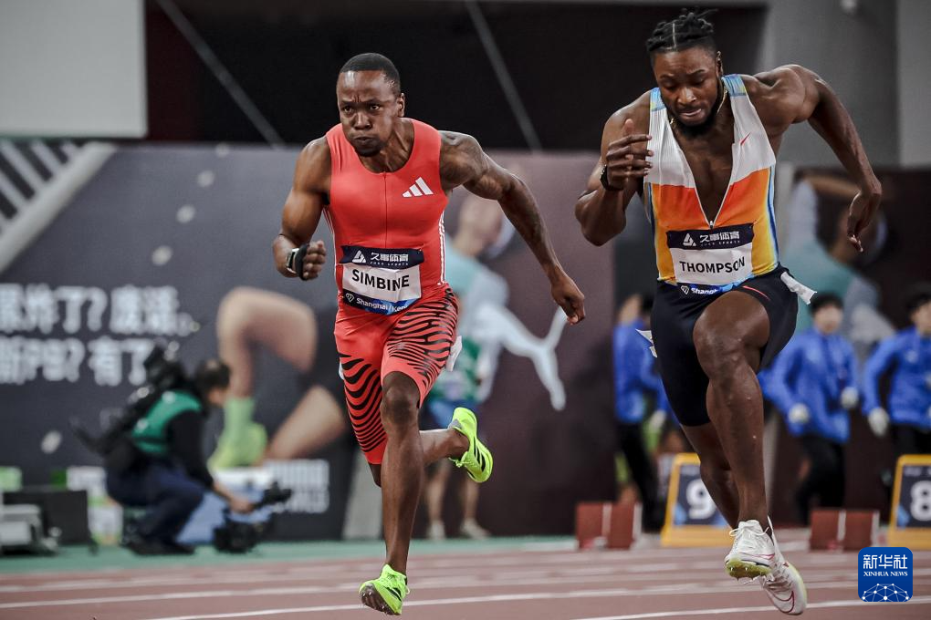 5月3日,南非选手辛比内(左)和牙买加选手汤普森在男子100米比赛中。他们分获冠、亚军。