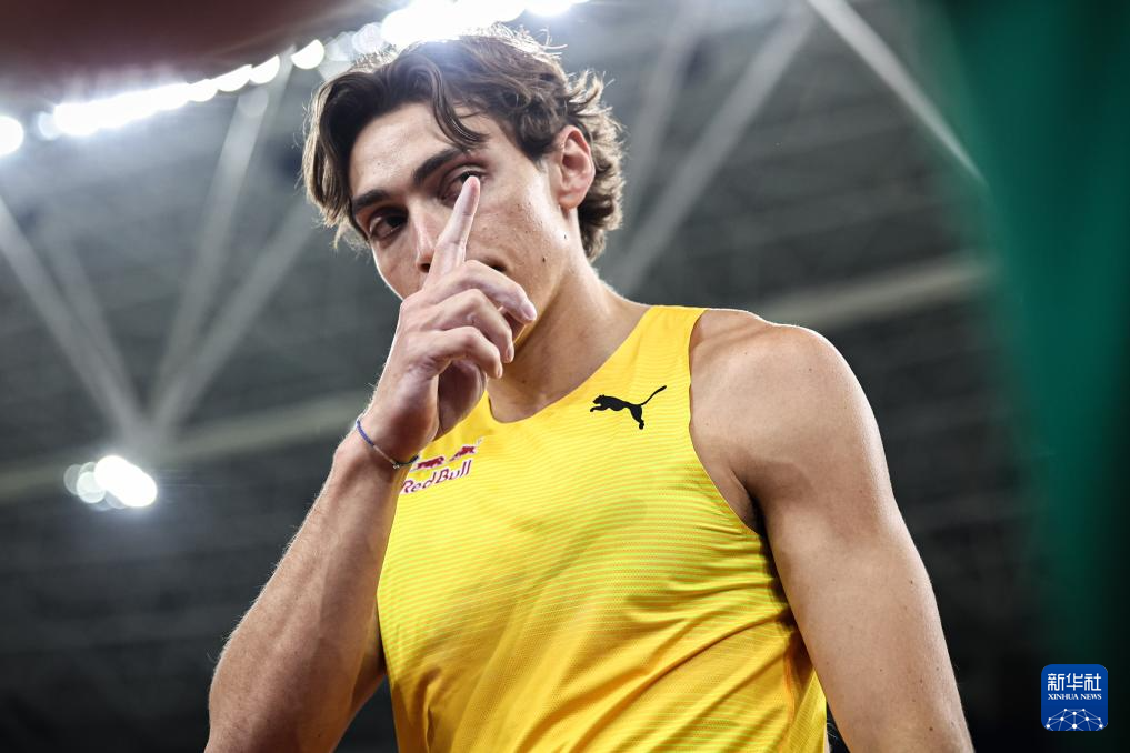 5月3日,瑞典选手杜普兰蒂斯在男子撑杆跳高比赛中。他以6米11的成绩获得冠军。