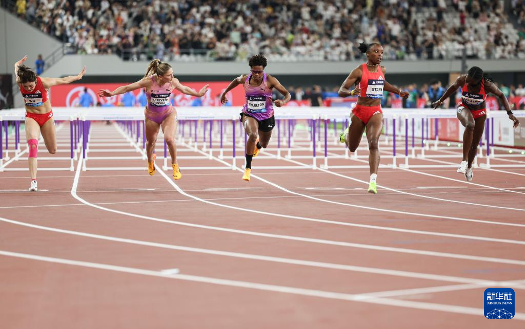 5月3日,美国选手斯塔克(右)在女子100米栏比赛中。她以12秒42的成绩获得冠军。
