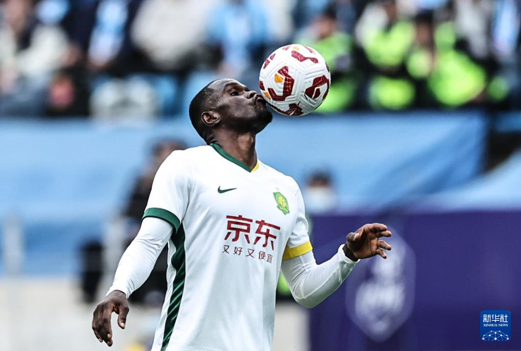 5月5日,北京国安队球员恩加德乌在比赛中控球。