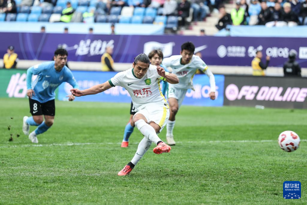5月5日,北京国安队球员张玉宁(前)在比赛中主罚点球被扑出。