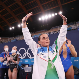2021年7月25日,丘索维金娜在东京奥运会女子跳马资格赛后向观众致意。新华社记者 曹灿 摄