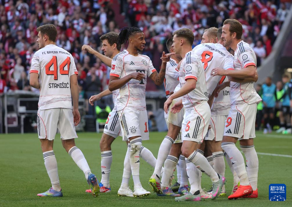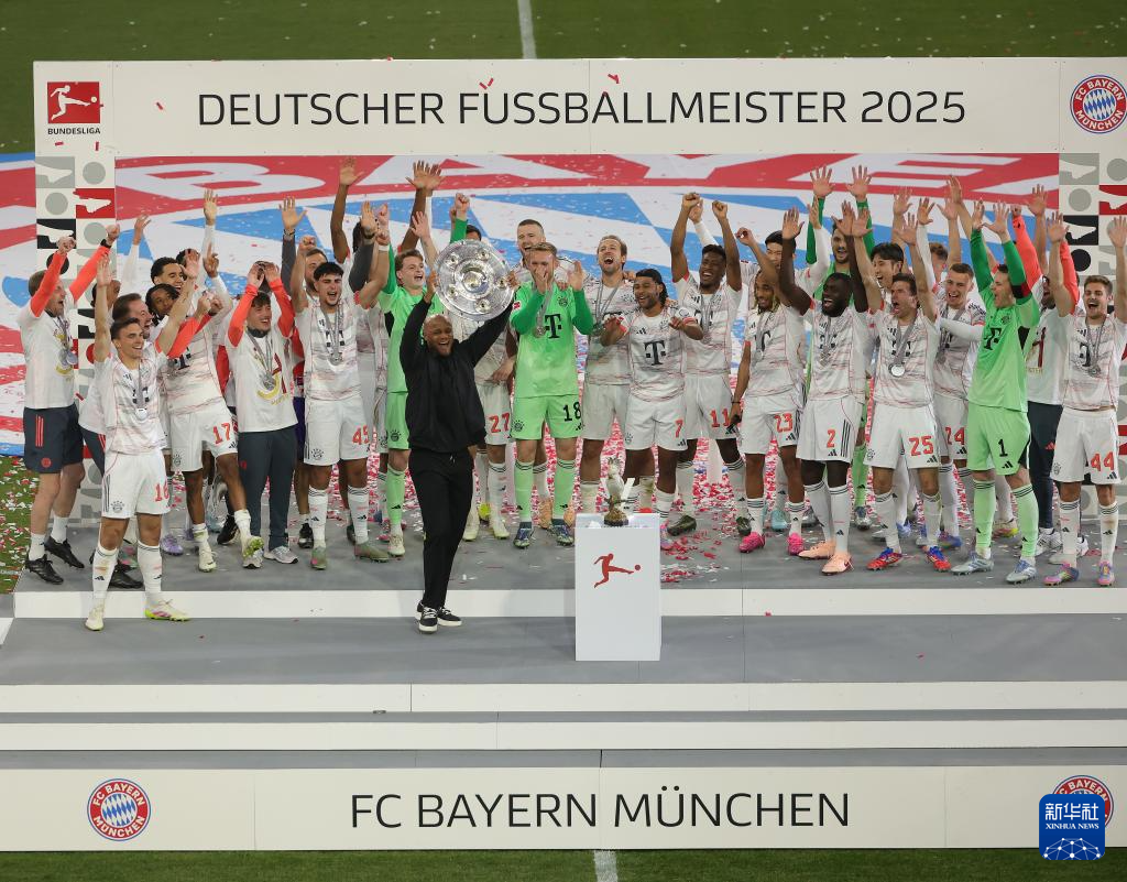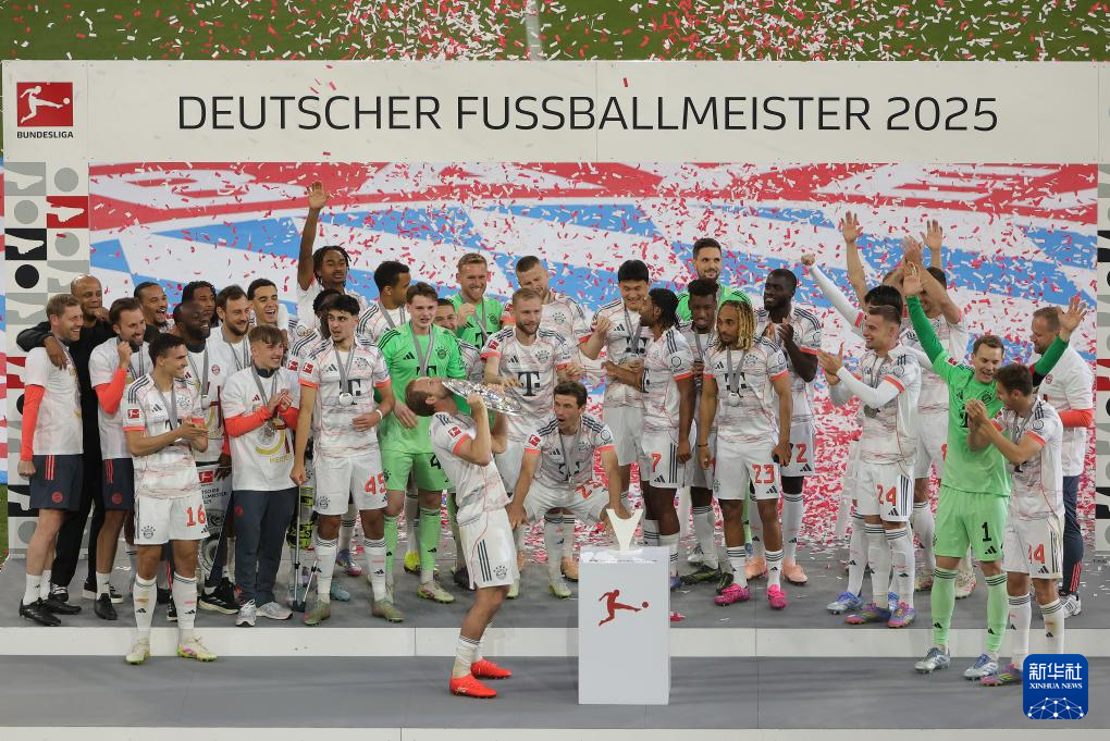 当日,在2024-2025赛季德国足球甲级联赛第33轮比赛中,拜仁慕尼黑队主场2比0战胜门兴格拉德巴赫队。赛后,拜仁慕尼黑队举行颁奖仪式庆祝夺得历史第33个德甲冠军。