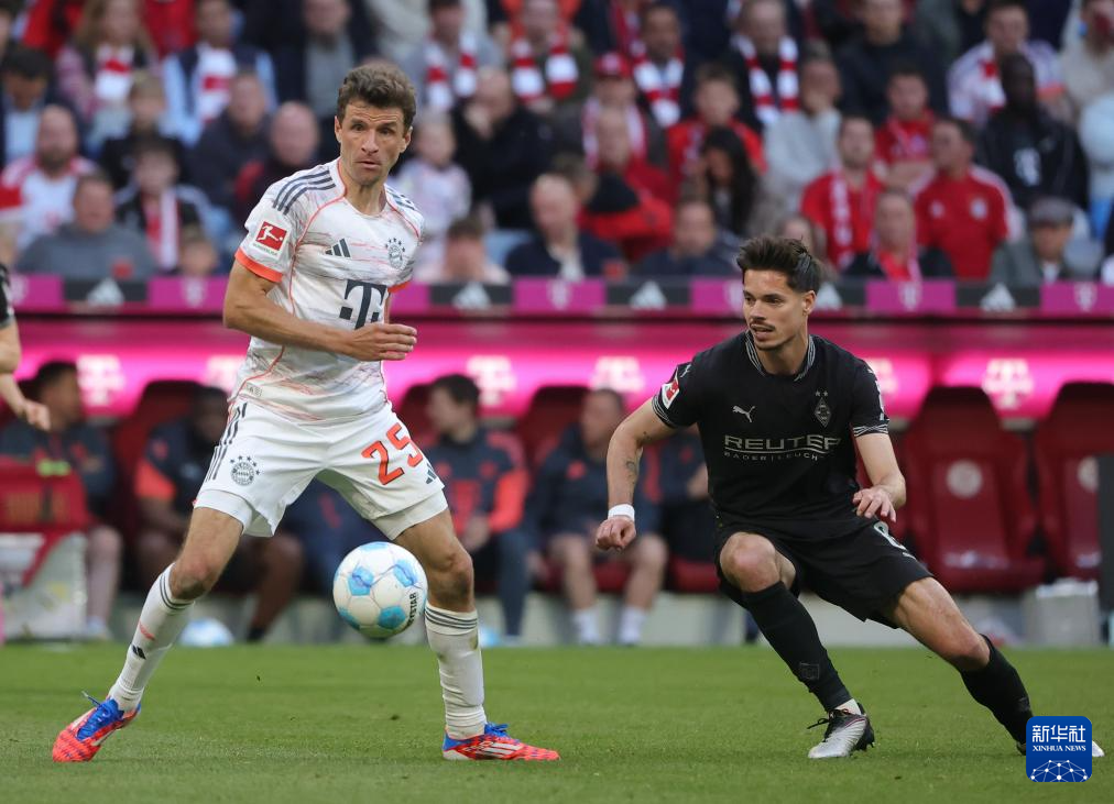 5月10日,拜仁慕尼黑队球员穆勒(左)与门兴格拉德巴赫队球员魏格尔在比赛中拼抢。