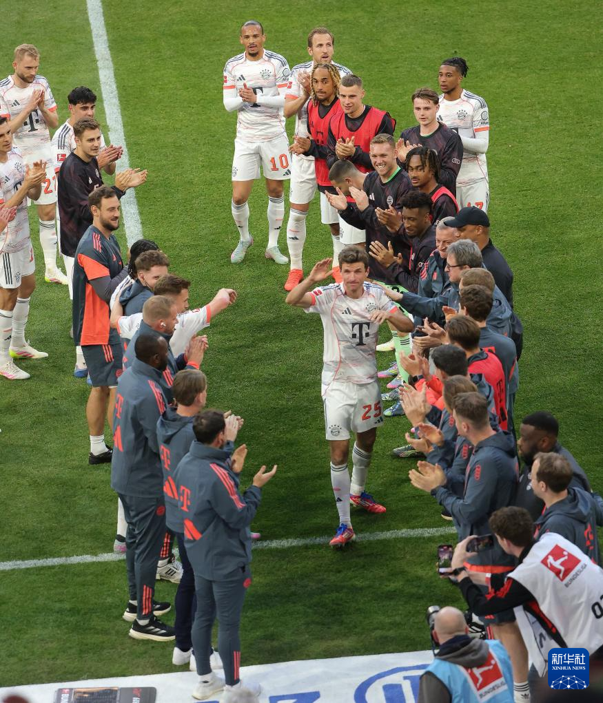 5月10日,拜仁慕尼黑队球员穆勒(前中)在被替换下场后,队友及工作人员列队向其致意。