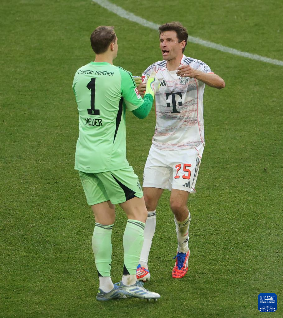 5月10日,拜仁慕尼黑队球员穆勒(右)在被替换下场前和队友诺伊尔致意。