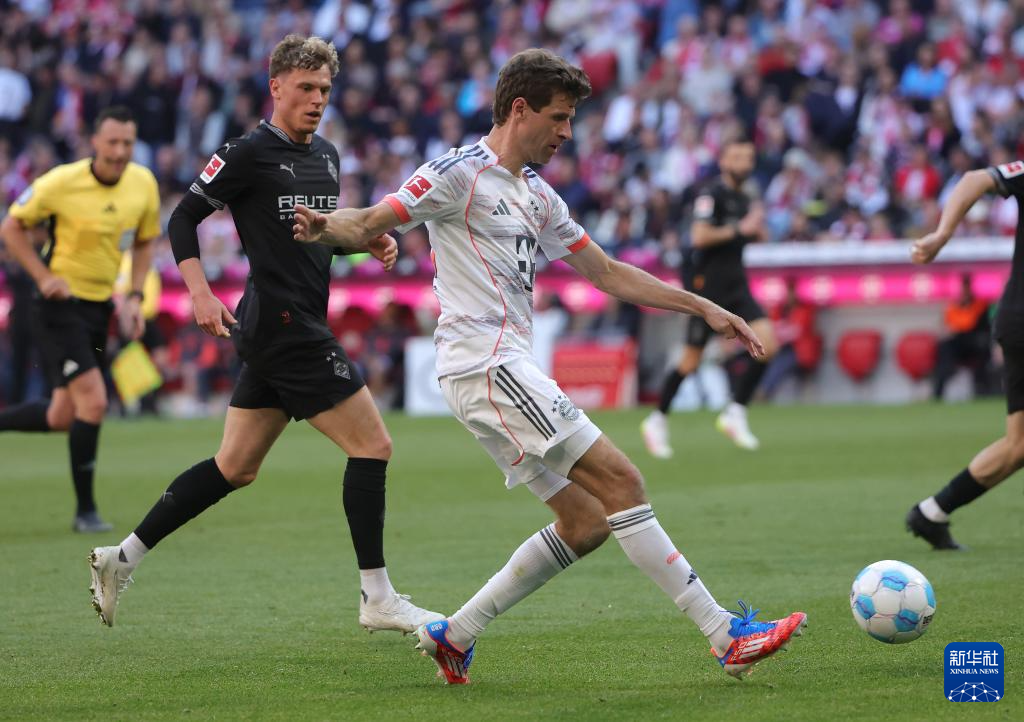 5月10日,拜仁慕尼黑队球员穆勒(右)在比赛中。