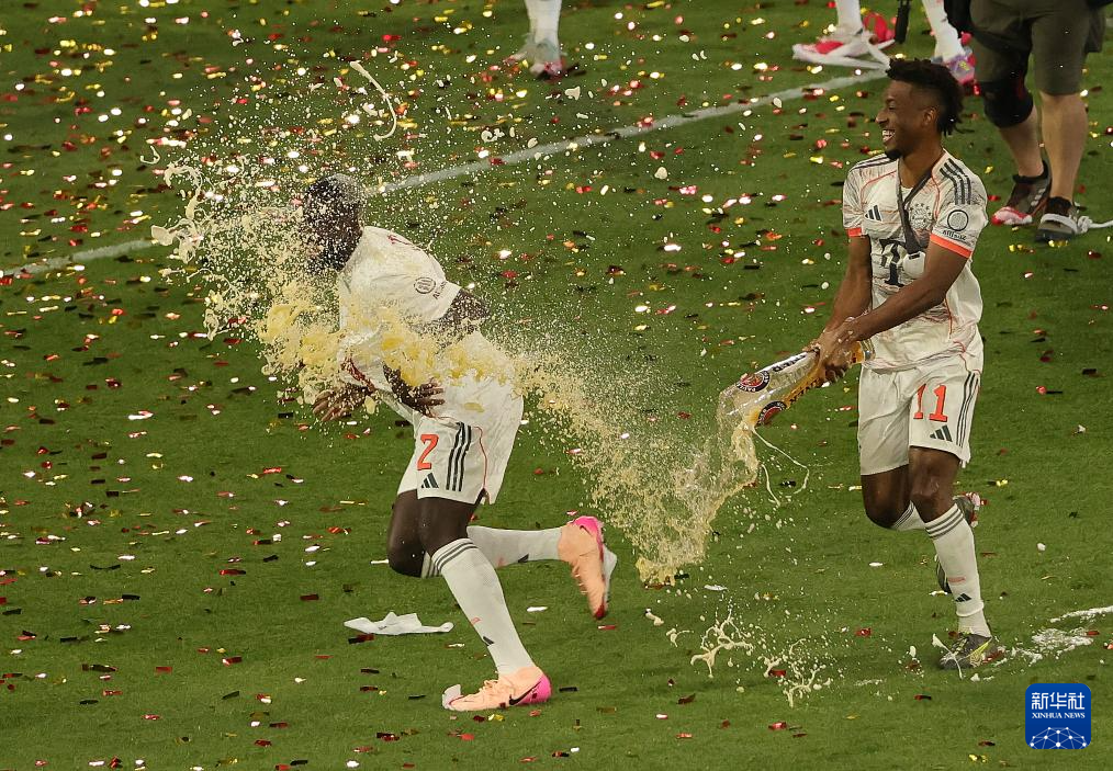 5月10日,拜仁慕尼黑队球员科曼(右)与队友乌帕梅卡诺赛后庆祝夺冠。