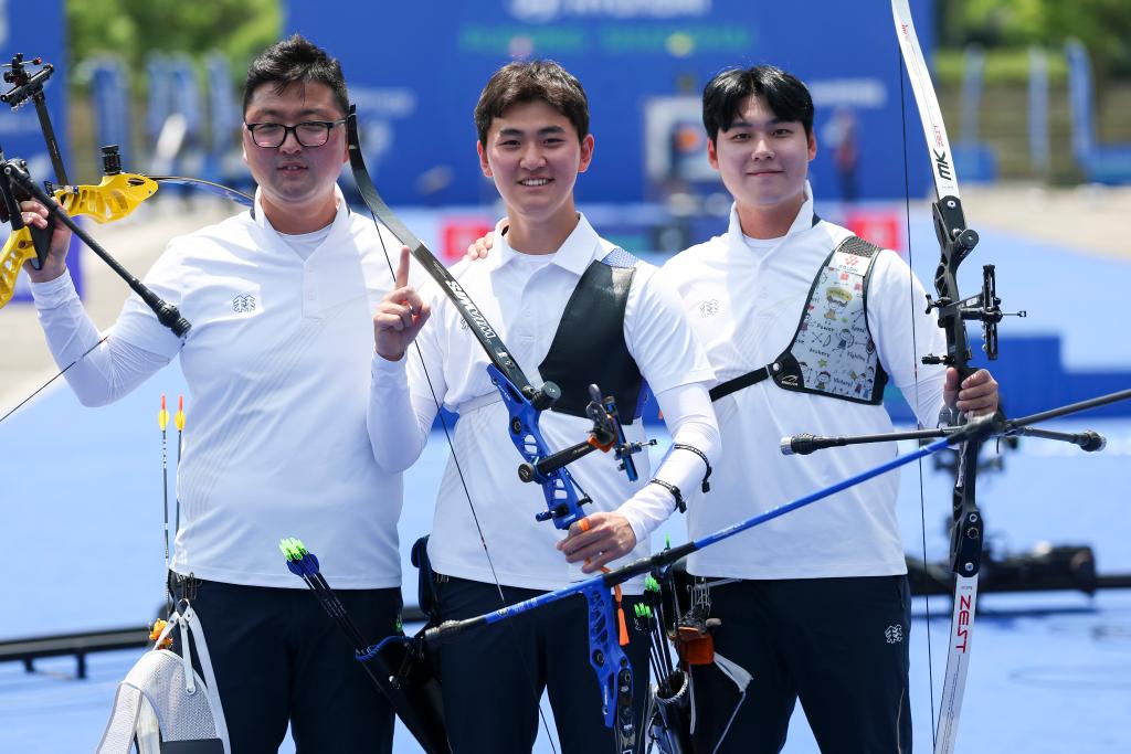 当日,2025射箭世界杯上海站男子反曲弓团体赛决赛举行。