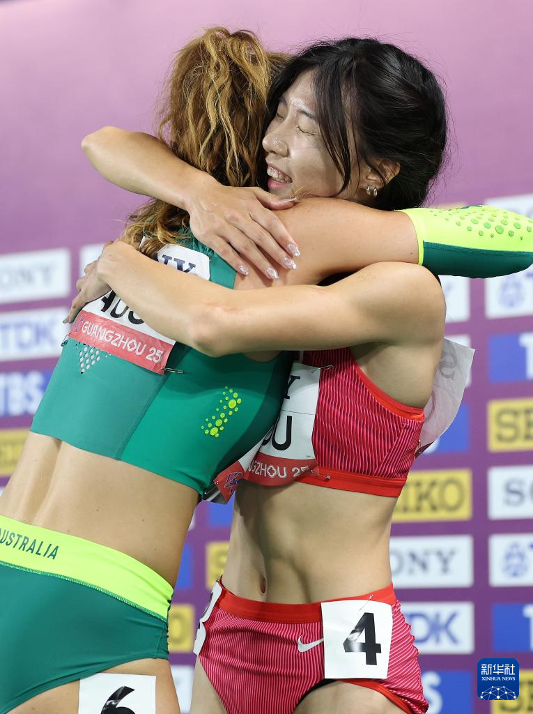 5月11日,中国队第一棒选手周莉(右)在赛后与澳大利亚队第二棒选手艾莉·比尔拥抱致意。