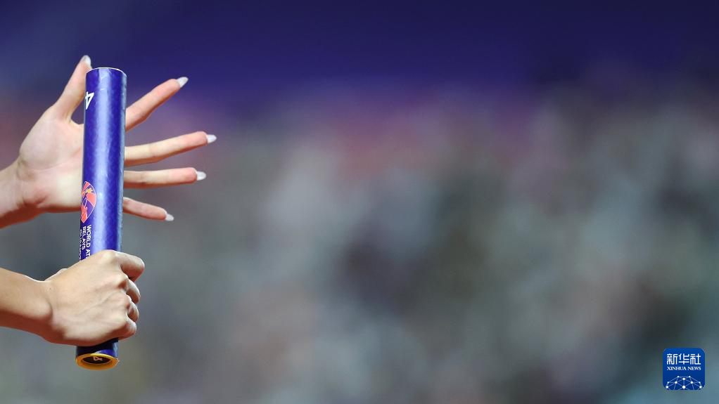 5月11日,中国队第四棒选手连芷(左)在比赛中接棒。
