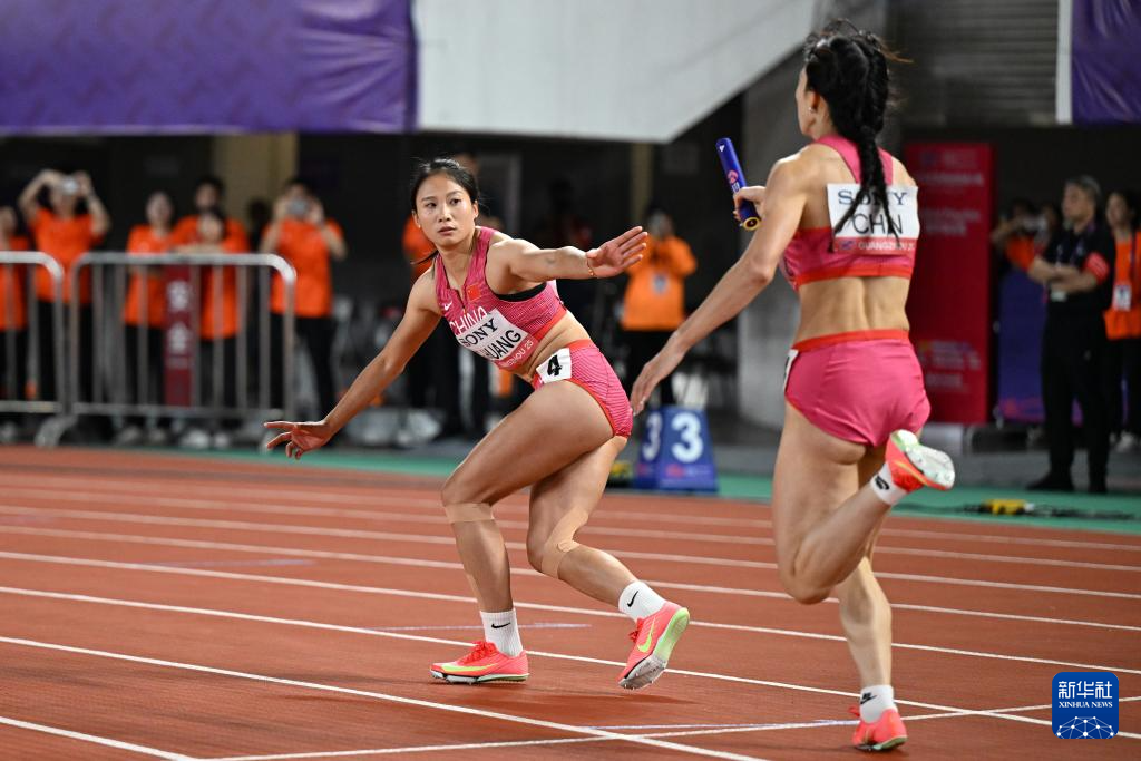 5月11日,中国队第一棒选手周莉(右)和第二棒选手黄瑰芬在比赛中交接棒。