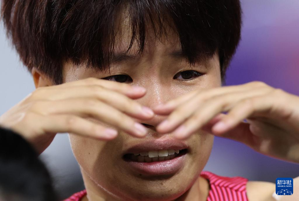 5月11日,中国队第三棒选手刘雨彤在赛后眼含泪水。