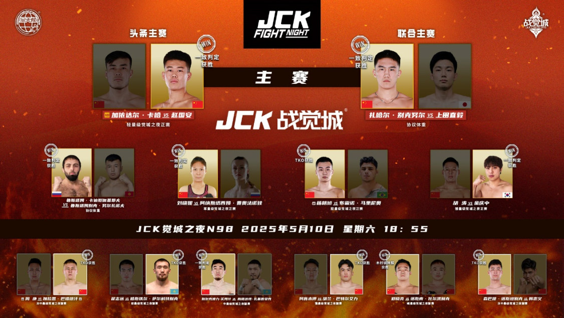 2025年5月10日,JCK觉城之夜N98结束,头条主赛赵国安一致判定战胜加依达尔·卡哈;联合主赛扎哈尔·别克努尔获得;正赛鲁斯塔姆·卡迪斯伽基耶夫、刘晓妮、金庆中均一致判定战胜对手,杨朝旭TKO布雷诺·马里尼奥;副赛郑晓亮木村锁降服塔斯肯·托尔洪别克,加拉思·巴哈提汗、哈斯铁尔·萨尔科特别克、胡兰·巴特尔艾力、森巴提·塔斯坦别克均TKO获胜,梅格达特·扎基普贝克赛前超重,未能终结对手,别尔克波力·买克什获胜。