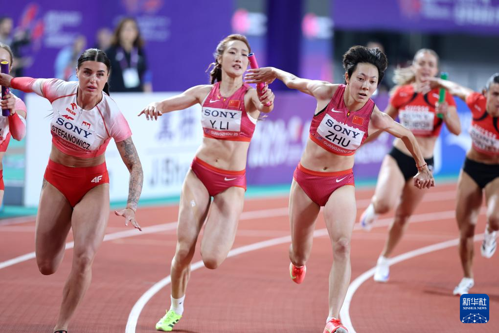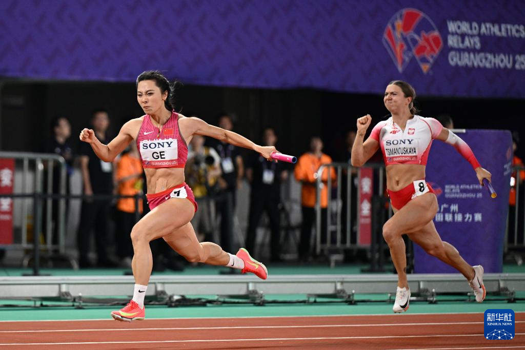 5月11日,中国队第三棒选手朱俊颖(右三)与第四棒选手葛曼棋(左三)在比赛中交接棒。