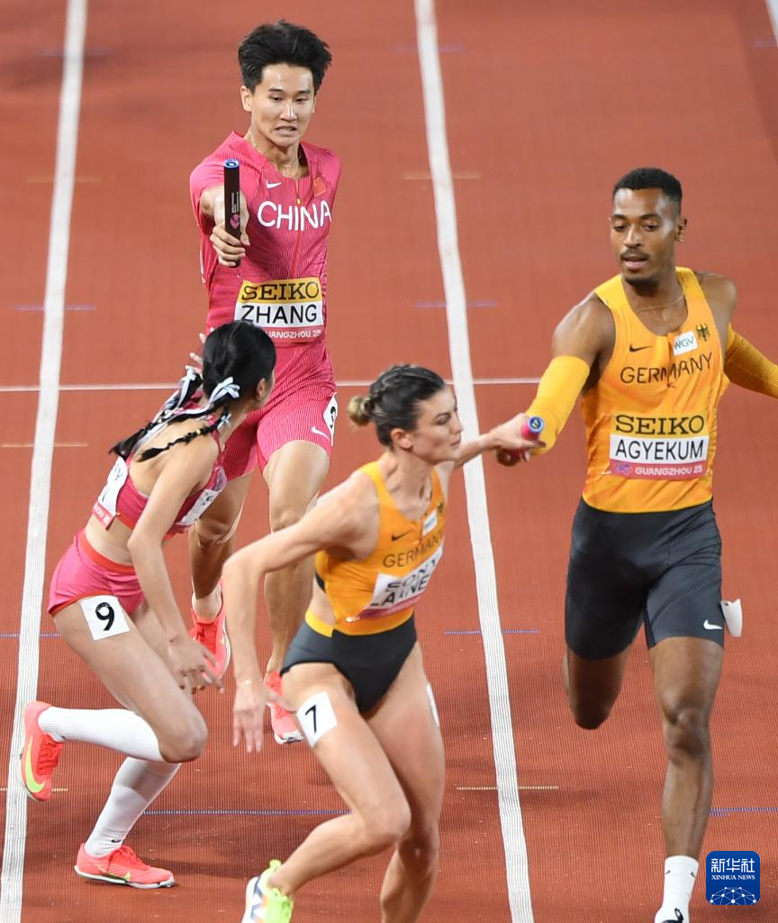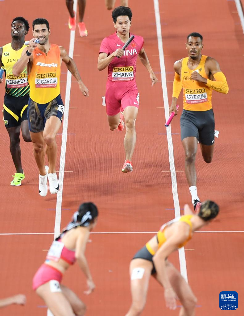 5月11日,中国队第二棒选手莫家蝶(前右)和第三棒选手张起宁(前)在比赛中交接棒。