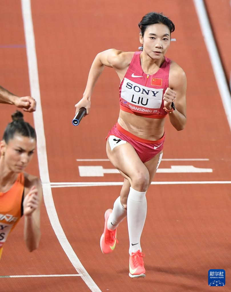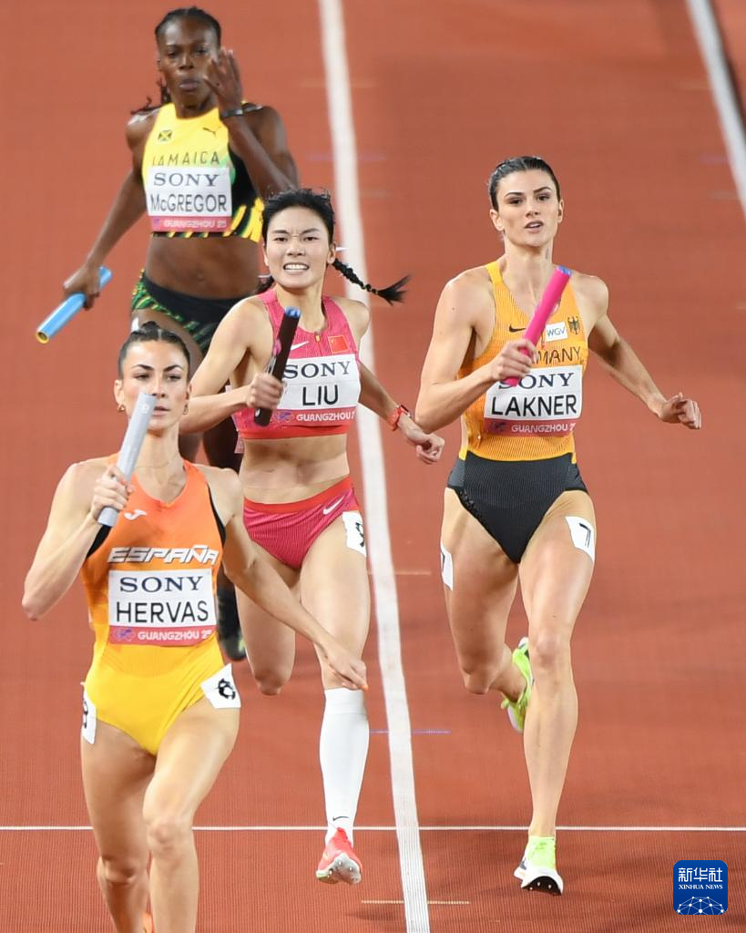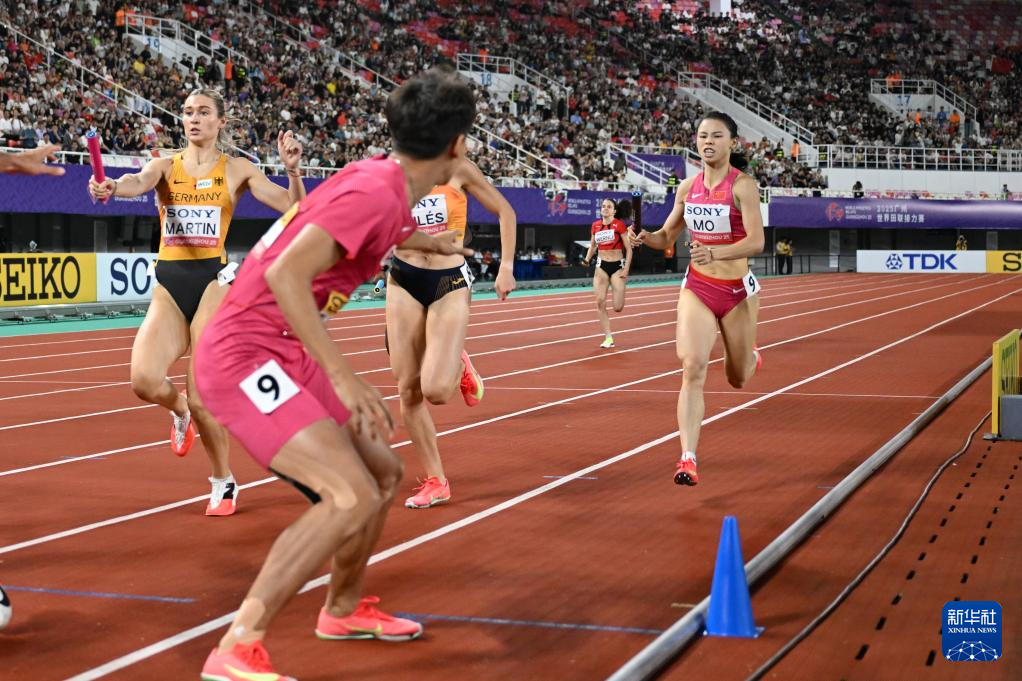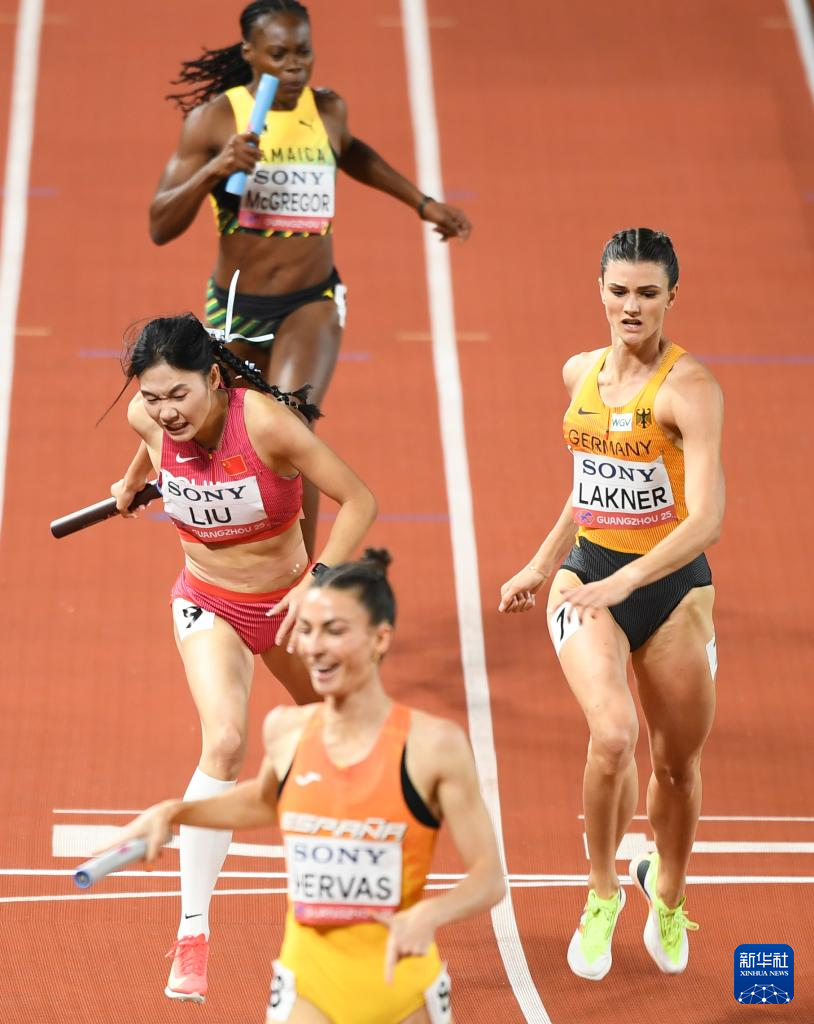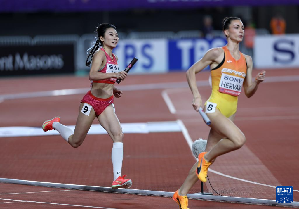 5月11日,中国队第二棒选手莫家蝶(右一)在比赛中准备交棒。