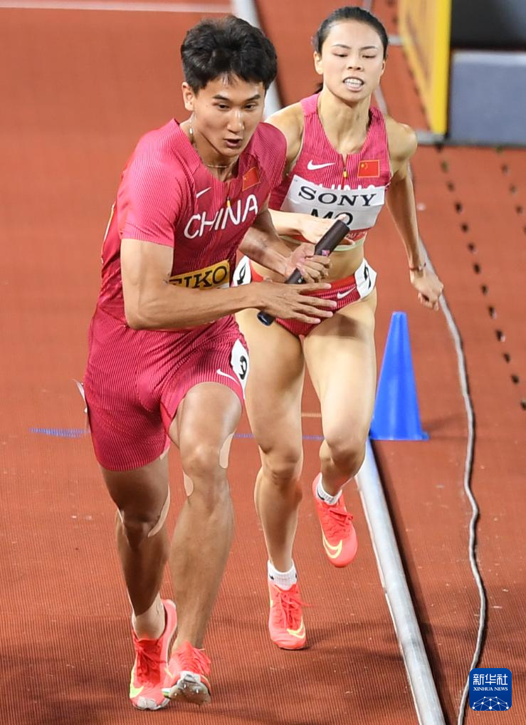 5月11日,中国队第二棒选手莫家蝶(右)和第三棒选手张起宁在比赛中交接棒。