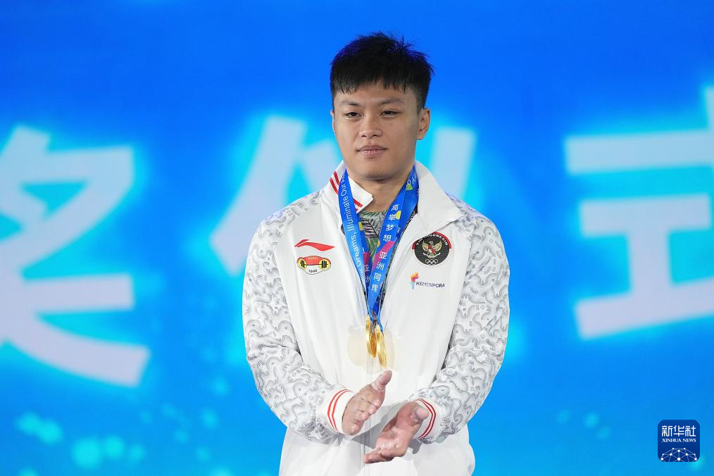 5月11日,印度尼西亚选手阿卜杜拉在颁奖仪式上。最终,他获得抓举、挺举、总成绩三项冠军,并以205公斤的成绩打破挺举世界纪录。