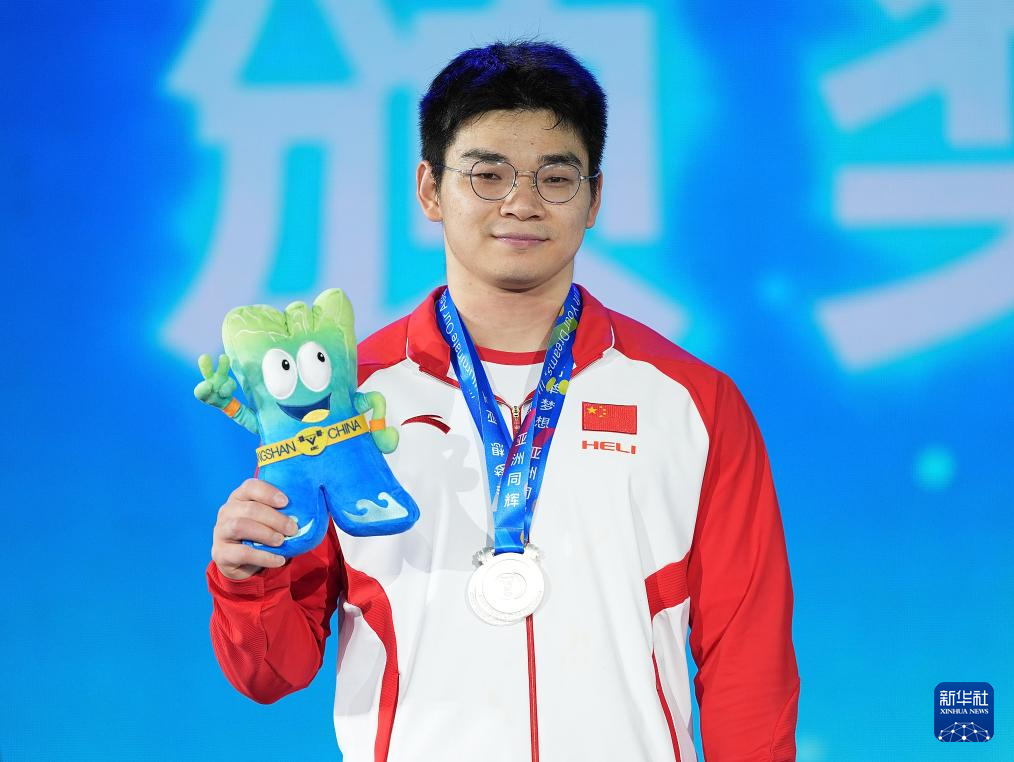 5月11日,中国选手吴海丰在颁奖仪式上。最终,他获得挺举、总成绩两项亚军。
