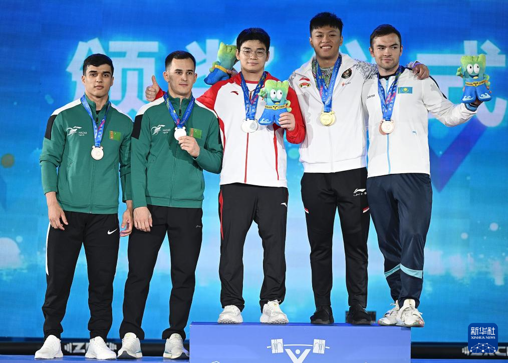 5月11日,总成绩冠军印度尼西亚选手阿卜杜拉(右二)、亚军中国选手吴海丰(中)、季军哈萨克斯坦选手赫列布托夫(右一)、抓举亚军土库曼斯坦选手拉希多夫(左二)、抓举季军土库曼斯坦选手列伊莫夫在颁奖仪式上。