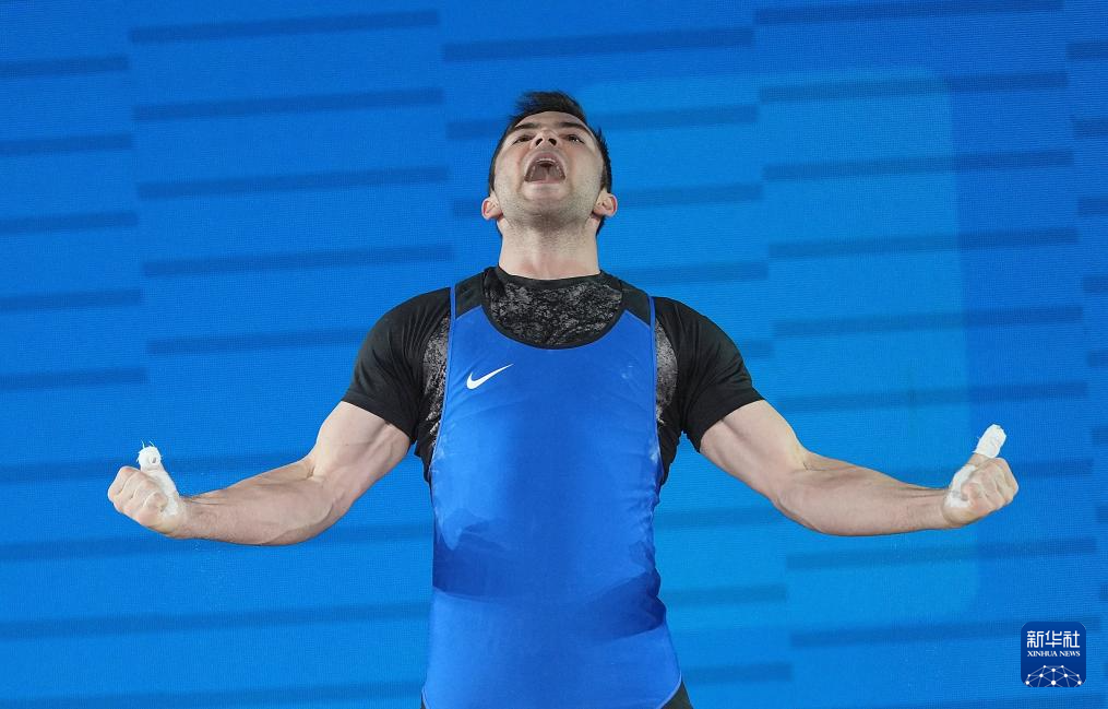 5月11日,哈萨克斯坦选手赫列布托夫在比赛中庆祝试举成功。最终,他获得挺举、总成绩两项季军。