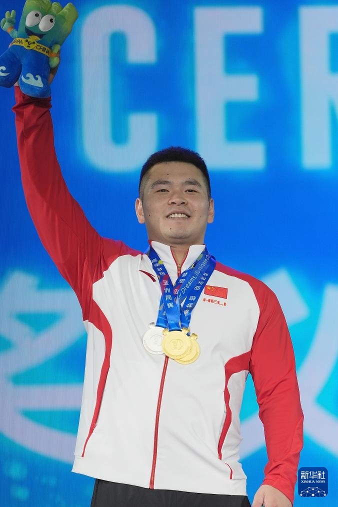 5月12日,中国选手罗崇阳在颁奖仪式上。最终,他获得抓举、总成绩两项冠军和挺举亚军。