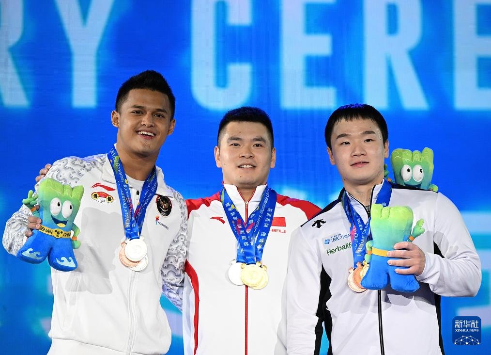 5月12日,总成绩冠军中国选手罗崇阳(中)、亚军印度尼西亚选手朱尼安夏(左)和季军韩国选手孙贤浩在颁奖仪式上。