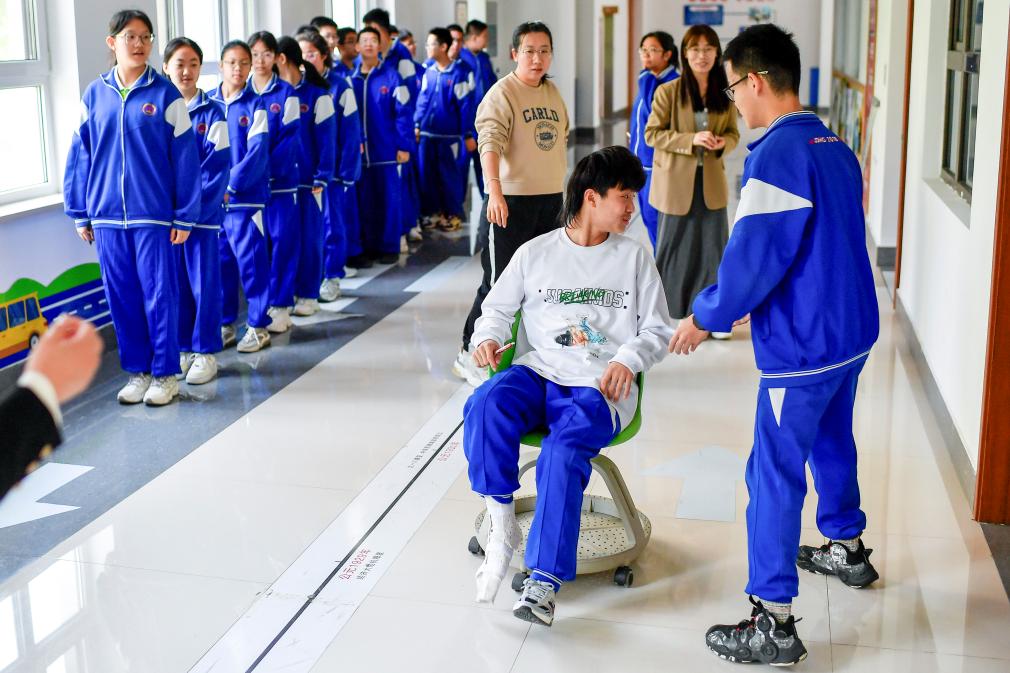 ↑崔圣雨受伤后,坚持来校上课(5月12日摄)。