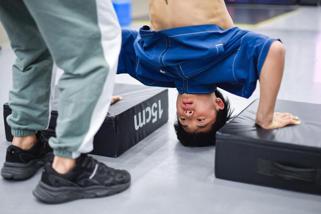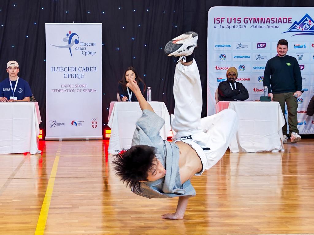 ↑崔圣雨在2025年U15世界中学生夏季运动会体育舞蹈(霹雳舞)男子个人项目比赛中。