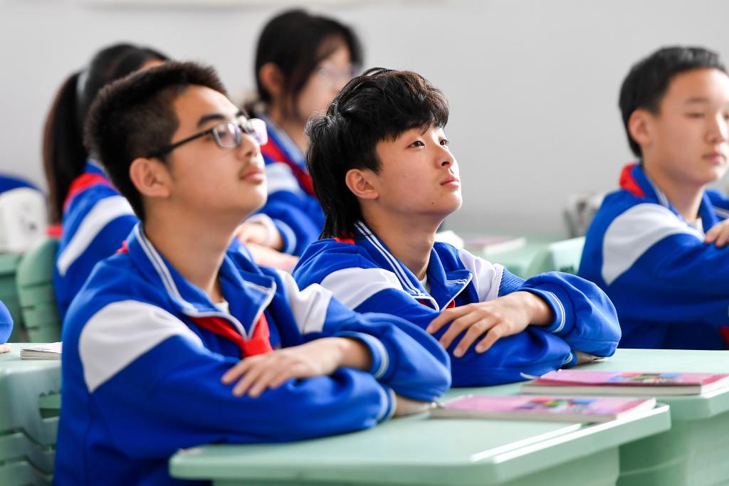 ↑崔圣雨与同学在教室上课(5月12日摄)。