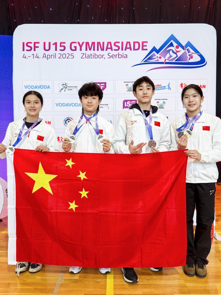 ↑崔圣雨(左二)与队友在2025年U15世界中学生夏季运动会上合影。
