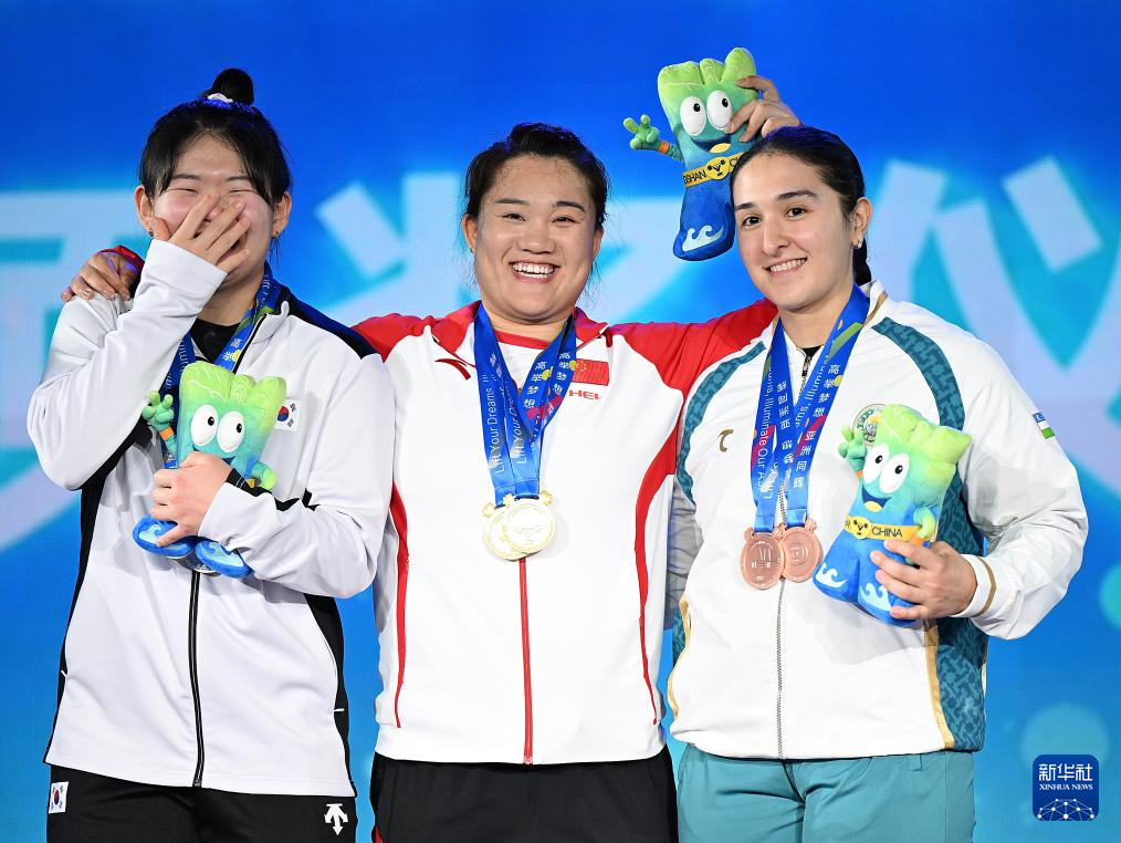 5月13日,总成绩冠军中国选手吴艳(中)、亚军韩国选手金伊瑟(左)和季军乌兹别克斯坦选手阿达什巴耶娃在颁奖仪式上。