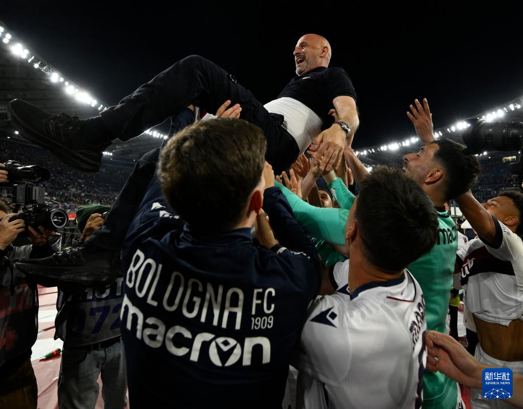 5月14日,博洛尼亚队主教练温琴佐·意大利诺庆祝胜利。