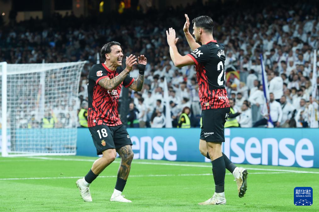 5月14日,马略卡队球员瓦连特(右)进球后与队友桑切斯庆祝。