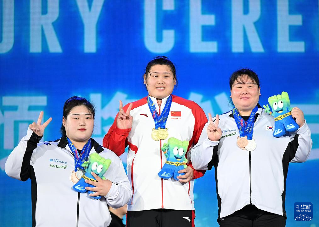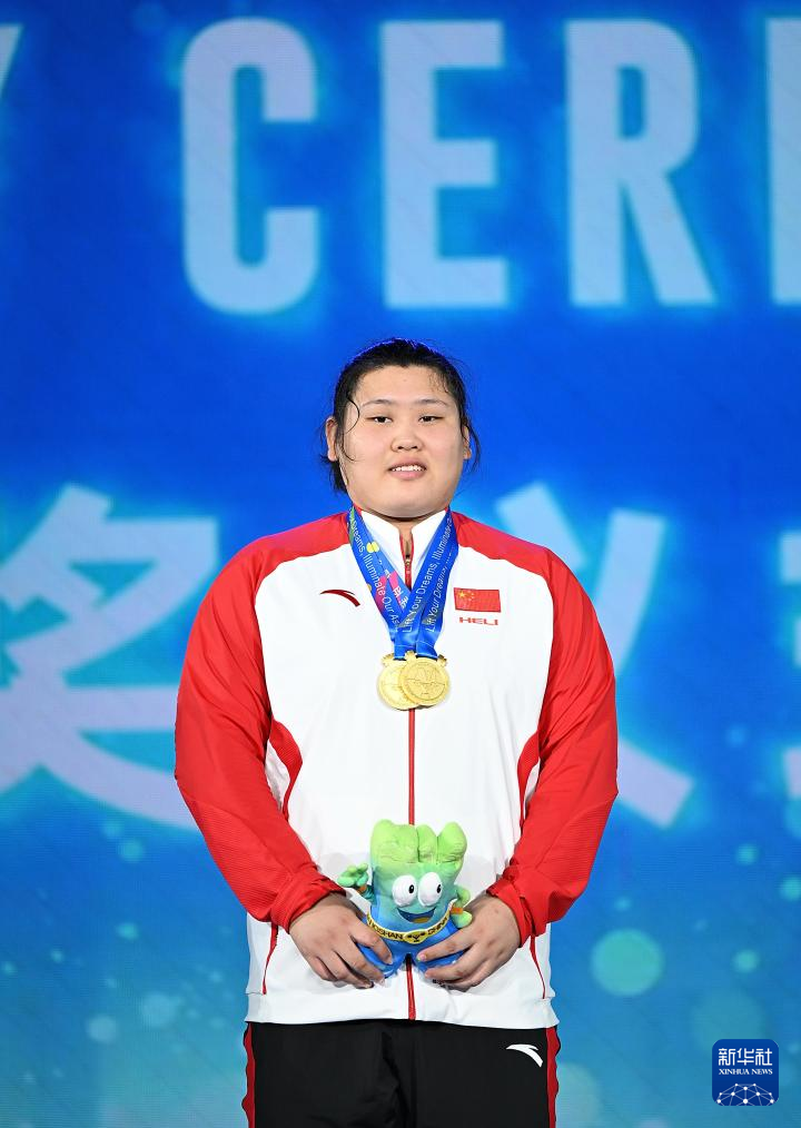 5月15日,中国选手李闫在颁奖仪式上。最终,她获得抓举、挺举、总成绩三项冠军。
